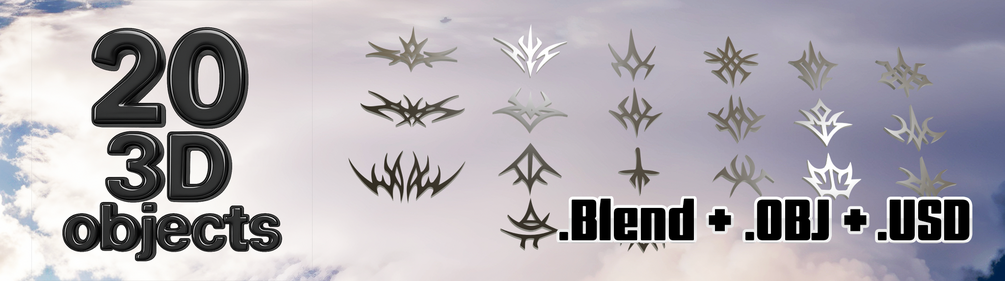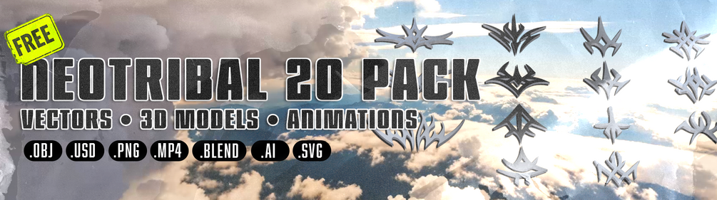 20 FREE NeoTribal shapes. .SVG · .AI · .PNG · .BLEND · Spinning Animations · Bonus HDRI included